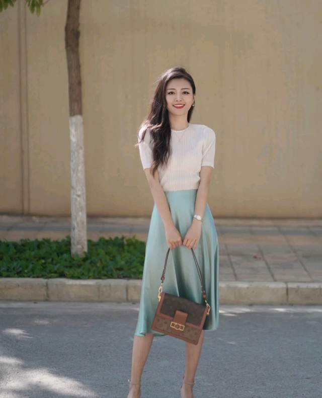想要把半身裙穿出高级感,除了要选对服装的颜色之外,还要选对服装的款式,更要注重穿搭风格,这位时尚博主所穿的这套服装就让人眼前一亮。