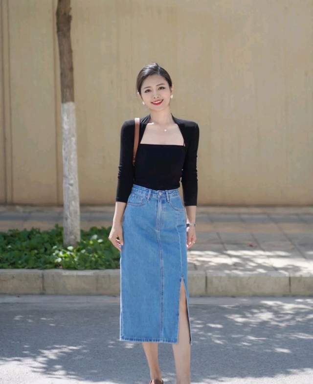 可以借鉴一下这位时尚博主的穿搭风格,她选择了简简单单的黑色上衣搭配蓝色牛仔半身裙,这样的搭配方法很简约却很耐看,在视觉上不仅显色,还能避免沉闷感。