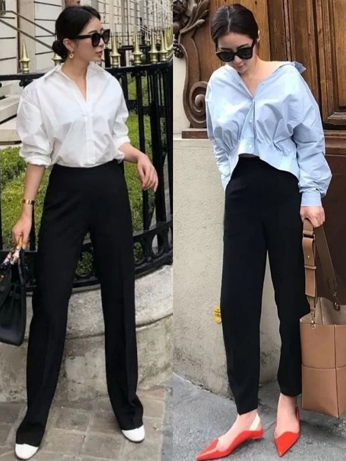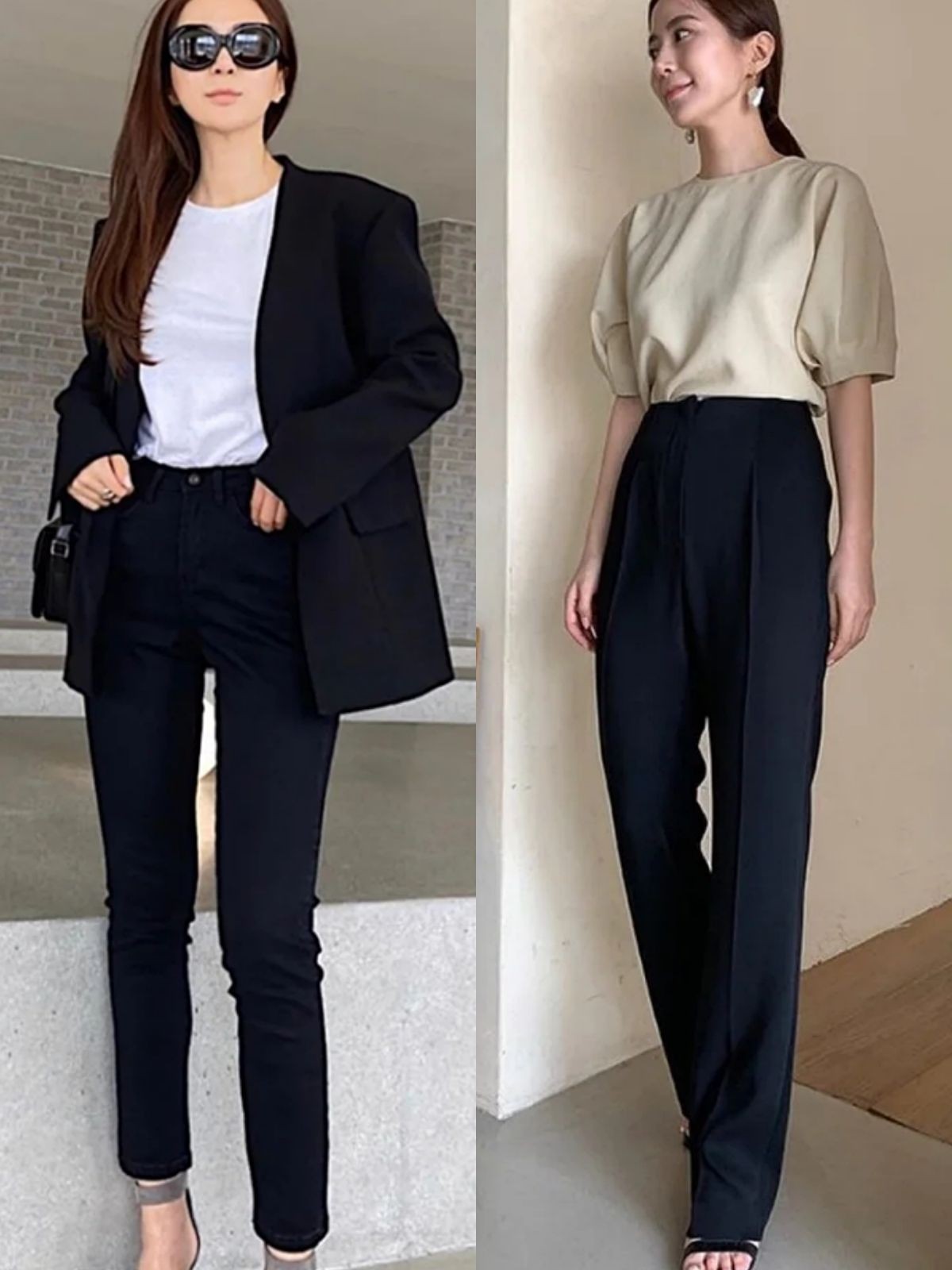 如果说显高是高腰裤的最大魅力,那么,显瘦就是高腰裤的第二魅力,只是,并非所有高腰裤的都显瘦,只有上面这种黑色色彩、修身版型的高腰裤才显瘦。另外,跟其它裤子比起来,高腰裤的搭配方式也比较丰富,比如“牛仔外套+高腰裤”、“针织短袖+高腰裤”、“露脐上衣+高腰裤”等等,尤其是下面几种搭配方式,洋气得很。
