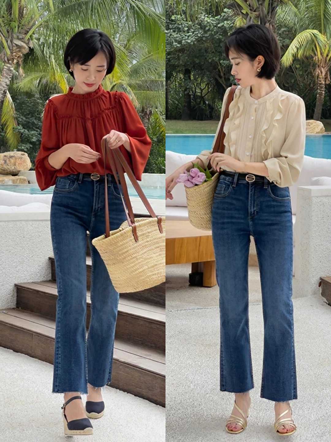 在平时生活中穿衬衫,最好的办法就是搭配牛仔裤,这一组造型一般不会出错,而且很耐看,像这些衬衫塞进的高腰牛仔裤就能够让你的身材得到调整,增高显瘦的效果挺好的,并且还可以学习博主这些高腰九分牛仔裤搭配上短衬衫的方式来修饰身材,露出脚踝更加轻盈。夏季搭配牛仔裤也可以直接用这种浅蓝色的款式,比较清新,不会觉得太沉闷老气。