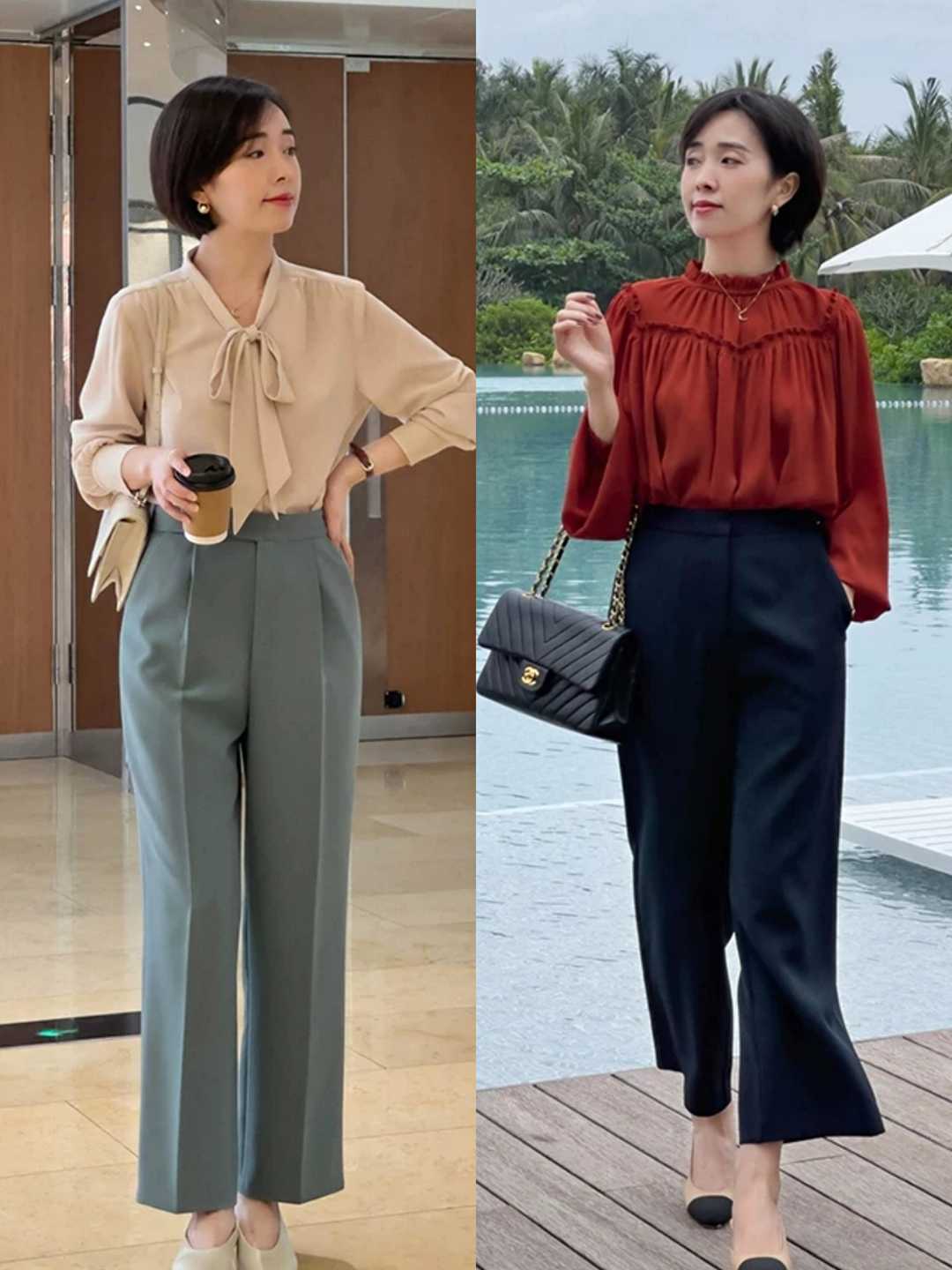 上班族要穿西装裤的话,可以考虑的色彩还挺多的,春夏可以多搭配浅色西装裤,相比黑色也更时髦,比如下面的潮人通过浅绿色西装裤搭配米色衬衫,这种浅色系的搭配看上去就非常的简单,而且很适合成熟女性,你还可以通过塞衣角来修饰你的腰线,从而塑造出大长腿。