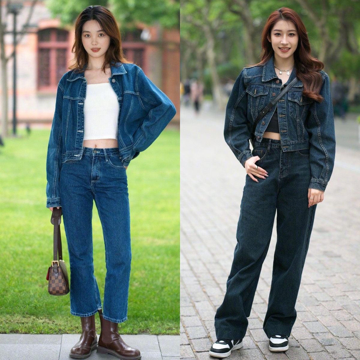 对于穿搭小白来说,上衣与高腰裤的套装穿法无疑是最佳选择,像下图中的短款牛仔外套与高腰牛仔裤的搭配,就是一个正确示范。既能省去搭配上的烦恼,又能打造出高级时髦的风格。