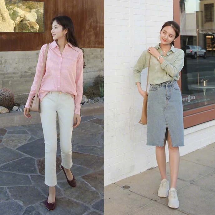 浅粉色的衬衫温柔淑女,极具减龄感,为了避免过于甜腻,加入白色的裤子进行搭配,可以有效缓和视觉观感,让整体的美感更温和。浅绿色的服饰非常符合春夏季的氛围感,元气又有活力,即便是搭配蓝色的牛仔裙也很协调好看。