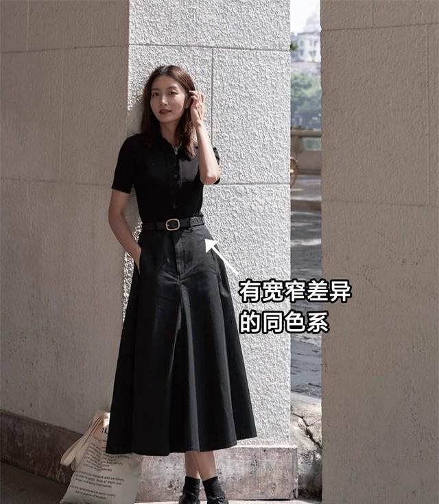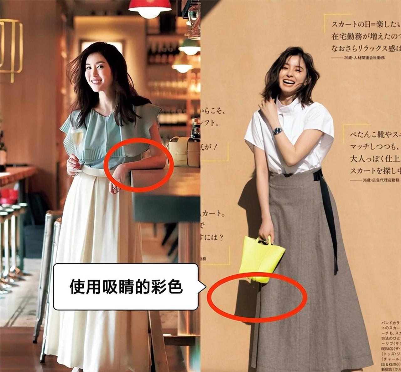 日系半裙要优先选基础色,但是可以在上半身或包包等配饰上使用小面积彩色或亮色。
