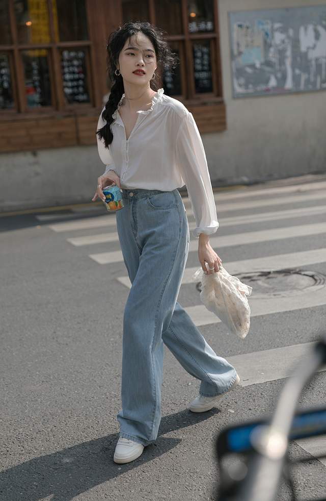 可以借鉴一下这位时尚博主的穿搭风格,她选择了带有花边设计的白色衬衫搭配蓝色牛仔裤,虽然很简约,却别有一番风味。