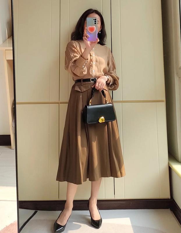 卡其色的衬衫+半身长裙,颇显复古又具有氛围感的穿搭,裙子是带些皱褶的款式,穿起来会更加显瘦,脚下选择的是一双黑色低跟单鞋,与腰间黑色腰带、包包进行了呼应,完美极了!