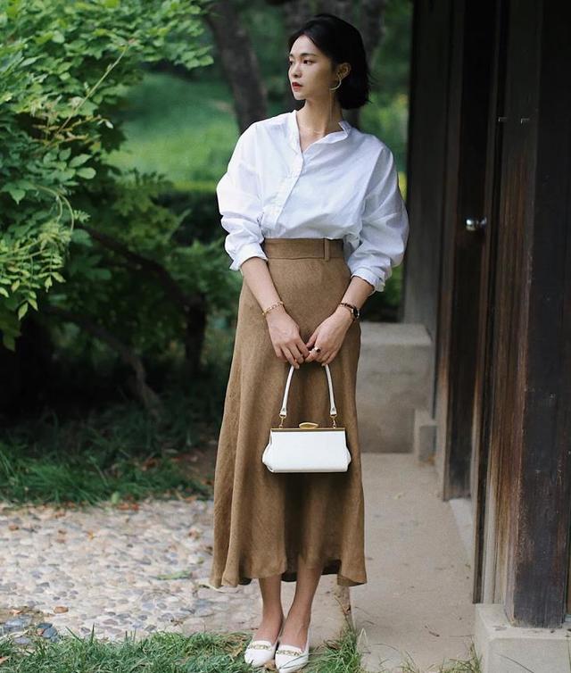 尖头鞋或许对于脚胖、脚掌宽的女性不友好,但是不得不说这种鞋子穿起来能在视觉上给人一种腿部线条被拉长的既视感。所以小个子在选择长裙时,不妨选择这么一双尖头鞋来搭配,白色平底尖头鞋,搭配卡其色半身长裙,上衣是一件白色衬衫,衬衫与鞋子之间进行了很好的色彩呼应,和谐又好看。