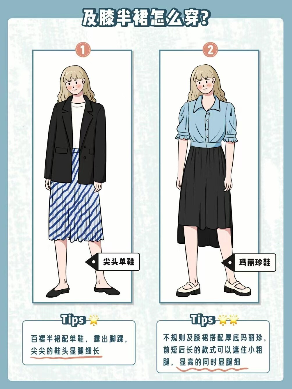 这类裙子选择鞋子建议露出脚踝和部分脚后跟,过膝裙盖住了膝盖,模糊了腿部比例,所以尽量多的露出腿部线条有利于拉长小腿,打造纤长的漫画腿。