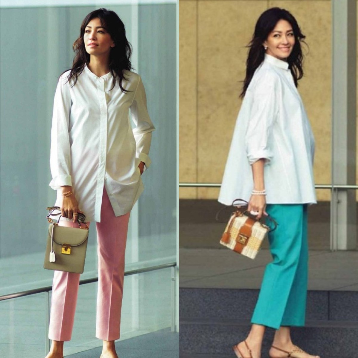 在搭配白衬衣时,我们可以先在颜色搭配上做些调整。如果想让你的搭配看起来更有活力感,那不妨选择白衬衣和糖果色系的下装搭配,像是下图中的明黄色+白色、橘色系+白色。