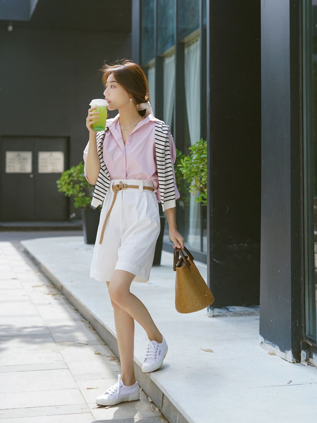 LOOK3:粉色衬衫+白色短裤+小白鞋。