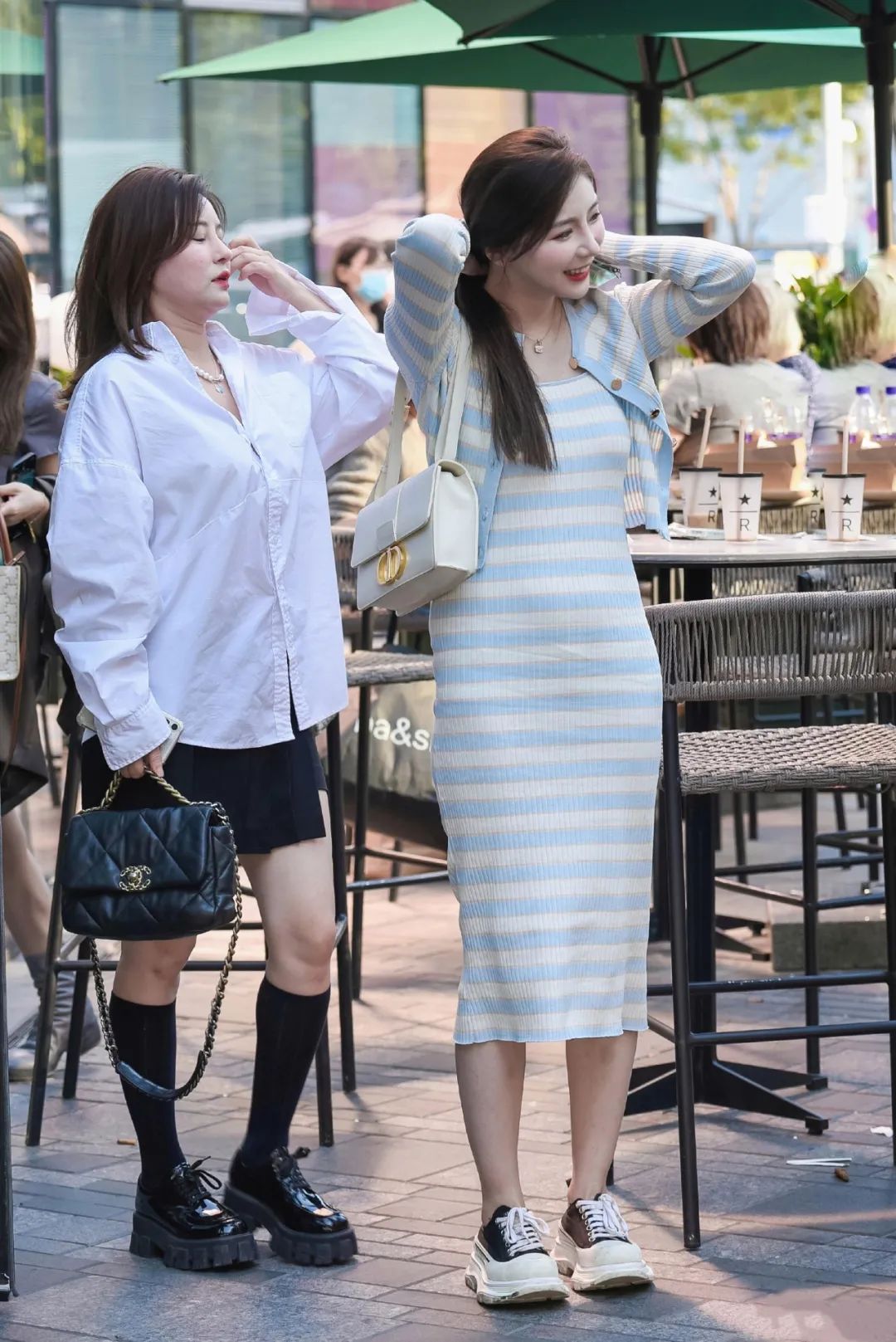 小姐姐一席紧身蓝黄连衣裙搭配针织开衫,精致好看,十足的女神范!