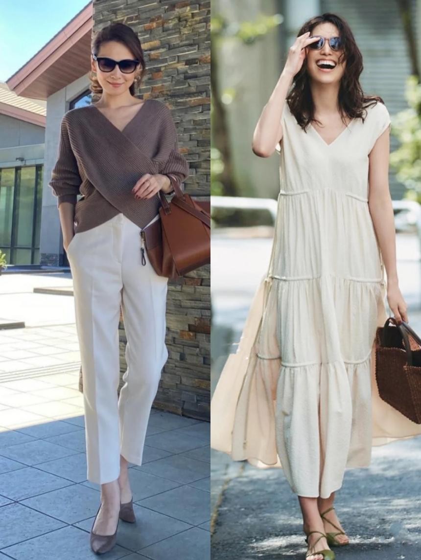 V领口应当是最常见的露肤领口,它能恰到好处的延伸颈部线条,露出精致的锁骨和天鹅颈线为穿搭注入小心机,这种领口给人以不紧绷的松弛感和随意感,充满迷惑,却丝毫不显色情。优雅女性的魅力总是会通过这样漫不经心的露肤来让人感知,不经意的展示曲线可以大大提升个人魅力。上图两件单品,V领针织衫和V领连衣裙全部都是轮廓色彩简单的基础款单品,但是加入了V领细节之后,简约的服装看起来就不再那么空洞了,处处散发着撩拨的高级感。