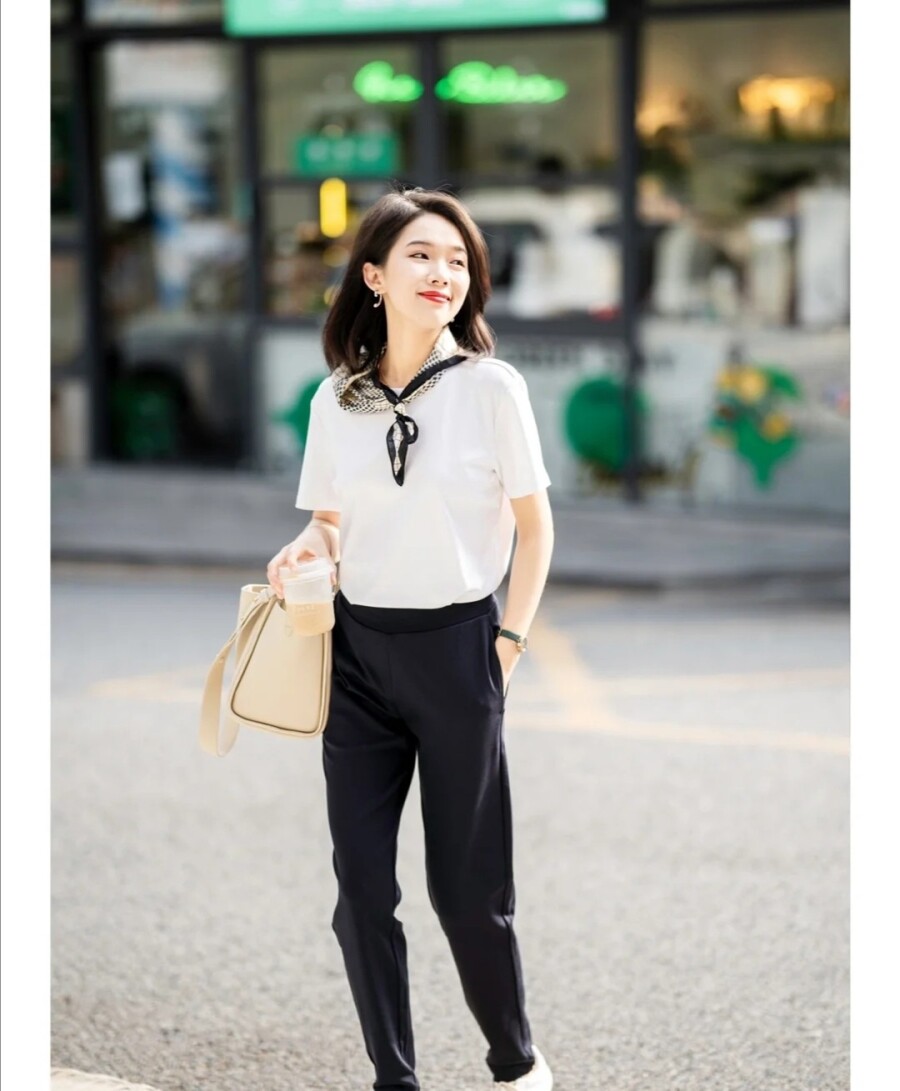 像这件纯白色的T恤,不管年龄大或小,驾驭它都不是问题,结合的黑色裤装可以根据腿型决定它的宽度或者是长度,如果认为自己的腿型姣好,不妨穿上黑色短裤,也可以采取黑色运动裤或者是黑色西装裤相配。