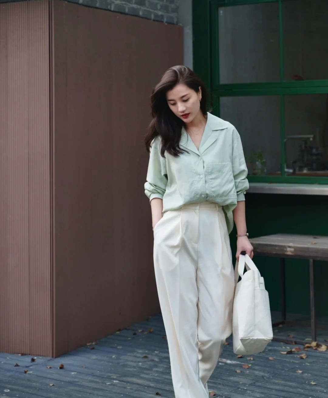 例如这条白色阔腿长裤,不管老少,穿上它都能呈现出相似的洒脱氛围和随性感。搭配一款薄荷绿色的衬衫,让配色有个性,但画面完全不杂乱。