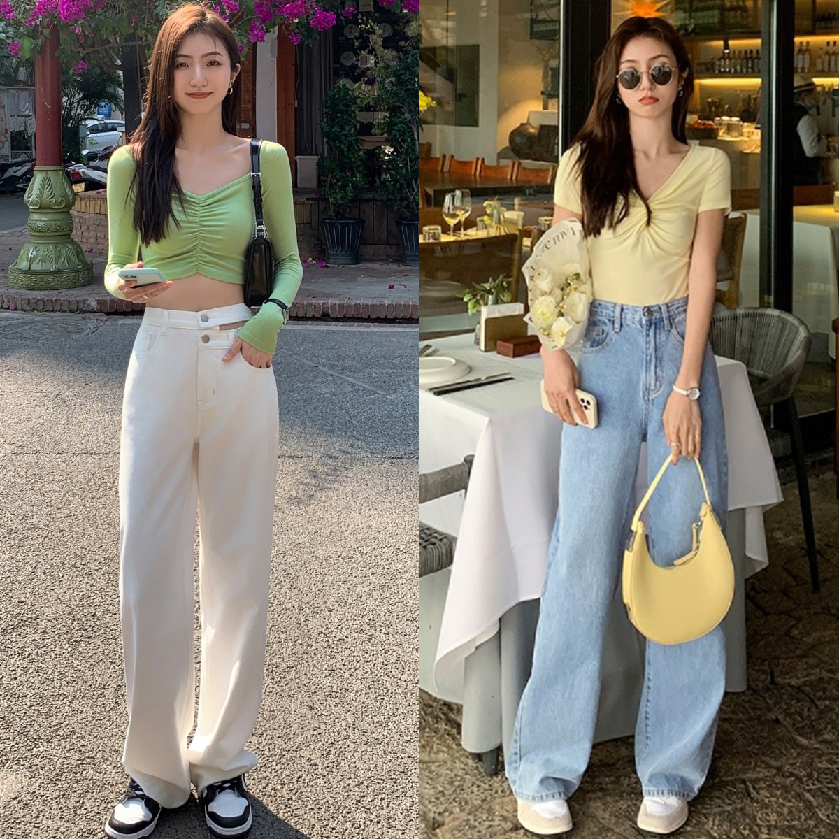 要想降低阔腿裤的撞衫率,我们可以先在颜色的搭配上多加注意,如果喜欢减龄有活力的配色,那不妨选择“糖果色系”的上衣搭配经典色或者牛仔蓝色系的阔腿裤。像是下图中的浅绿色、鹅黄色或是浅蓝色上衣等,都是很不错的选择。