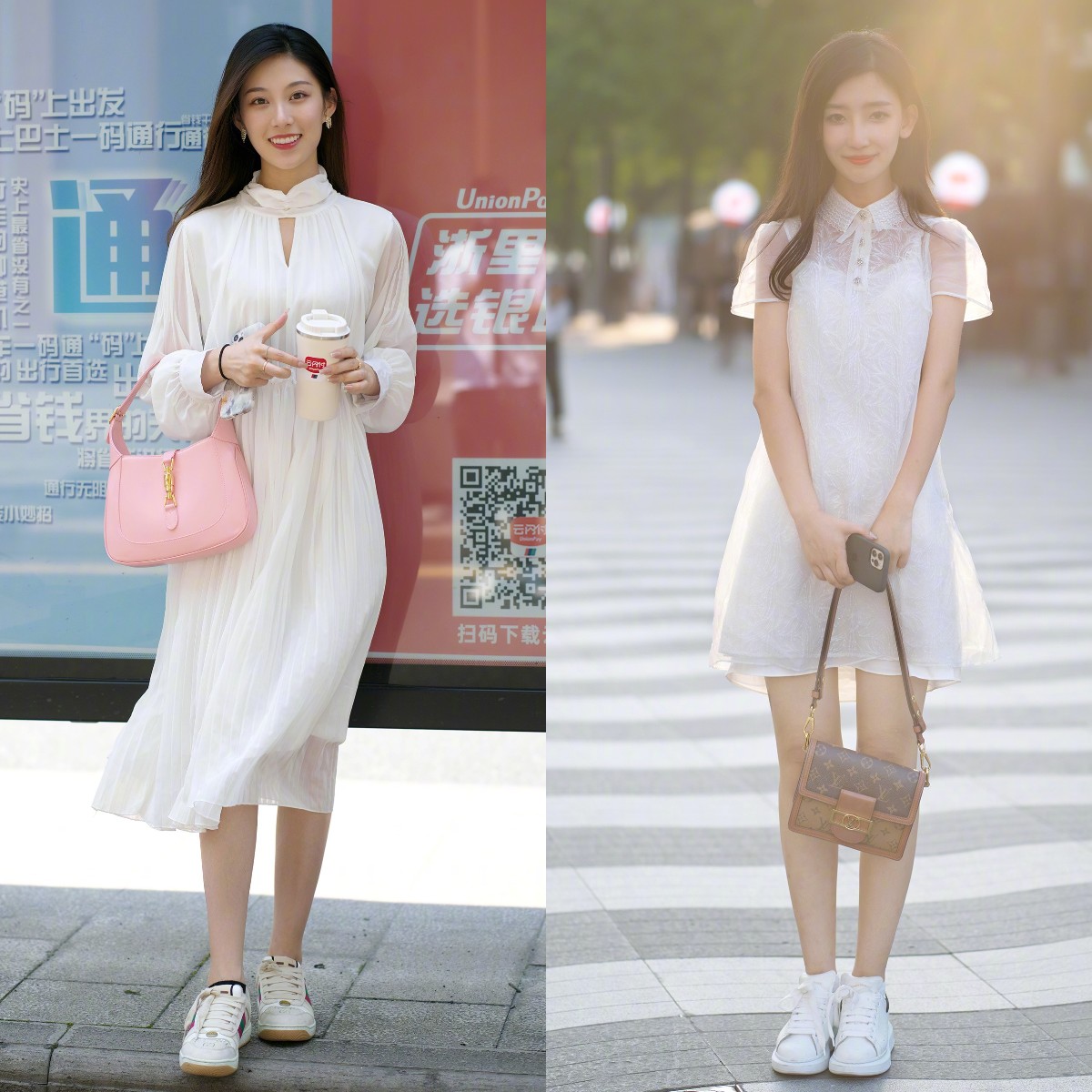 夏季,我们还可以选择款式轻薄一些的裙子搭配小白鞋,讲下图中的雪纺裙就是很不错的选择,既能满足透气感的需求,又能增添灵动飘逸的属性,会让你的搭配看起来更加乖巧甜美。