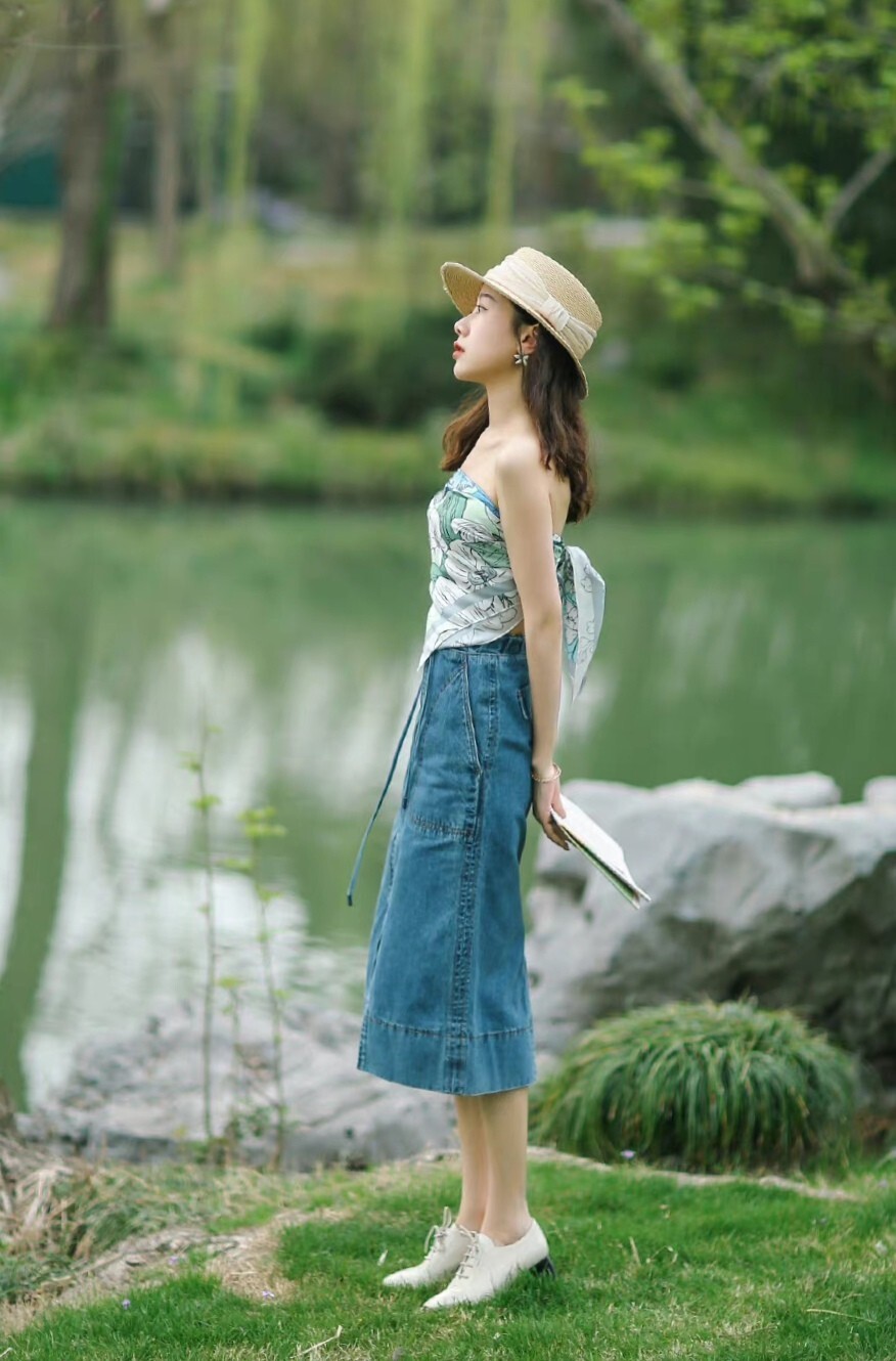过膝裙的长度一般不会太长,尤其是身材不是很高挑的女性,太长的裙装容易带来压抑感,同时又有压身高的危险,长度在小腿附近就刚好合适。挑选裙装的时候,可以选择长度刚好遮住小腿最粗的位置最佳,显瘦效果尤为明显。下图的牛仔半身裙就很时髦,看起来简洁干练,并且很容易遮肉,微胖的美眉可以尝试搭配起来。