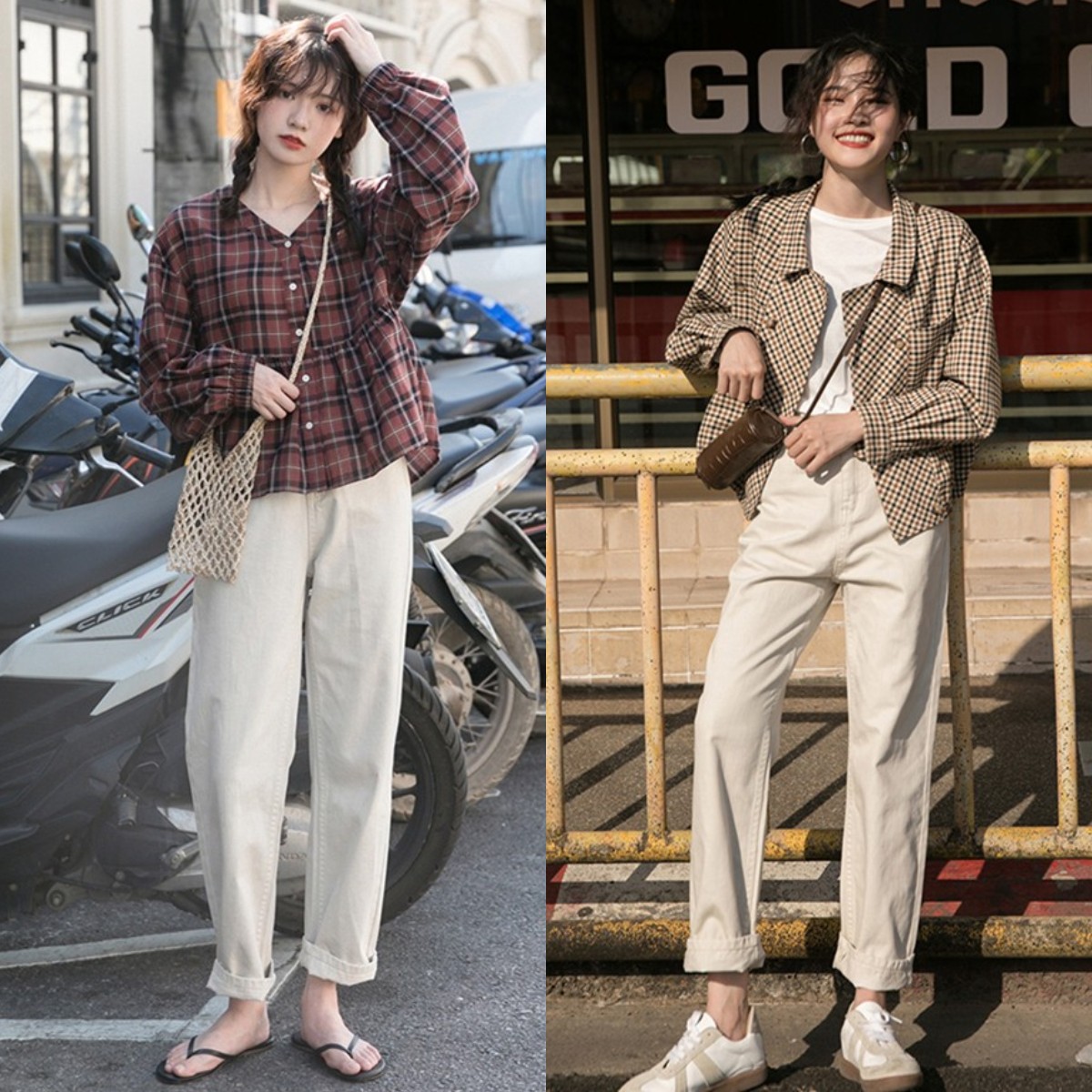 但要想穿出更加文艺复古的魅力,那就比较推荐你入手加入了格纹元素的上衣与白色裤子的搭配。格纹元素带有英伦复古的气息,与上衣结合在一起在加强色彩感的同时,又能加重复古属性。