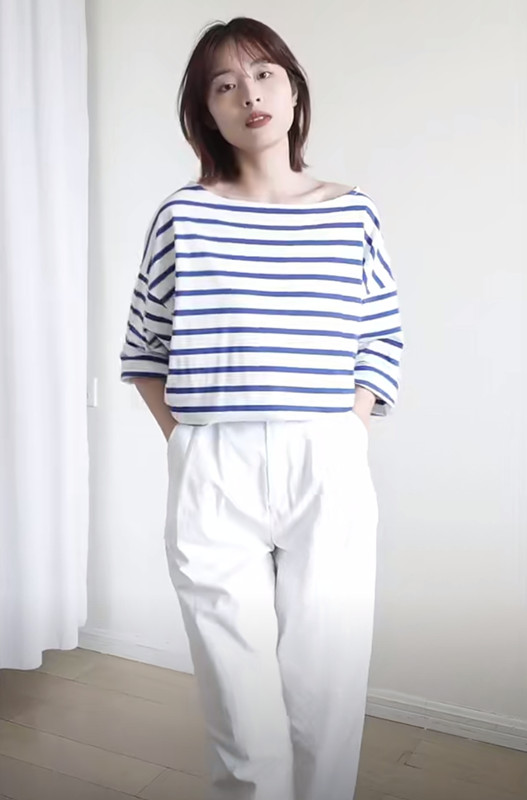 条纹是时尚界的经典元素,将它点缀在纯色T恤上,无疑是将潜在的单调沉闷气息一扫而空,随之而来的是高级、是得体、是优雅。而海魂条纹T恤为白蓝相间的配色,浩瀚的大海与蓝天蕴含其中,将夏日的炎热感尽消,展现精神抖擞的活力与朝气。穿着海魂条纹T恤的40岁女人,有着让人无法忽视优雅复古气息,像是穿过了中世纪的复古女人从画卷中飘然而出,高贵与典雅的魅力自然流露。