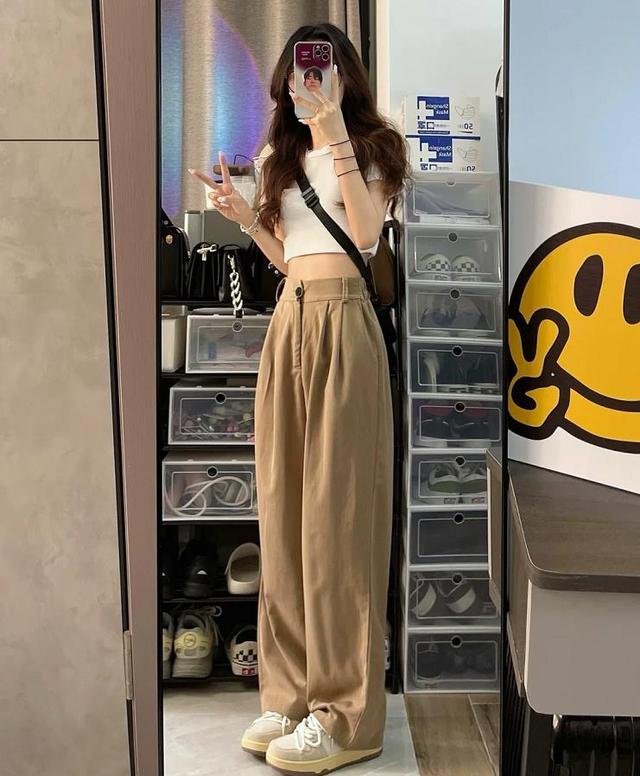 下身选择的高腰卡其色休闲西装裤,宽松的裤腿,真的是包容性极佳,这么一条裤子穿起来实在是很休闲显瘦,脚下踩着一双运动鞋,舒适且休闲。