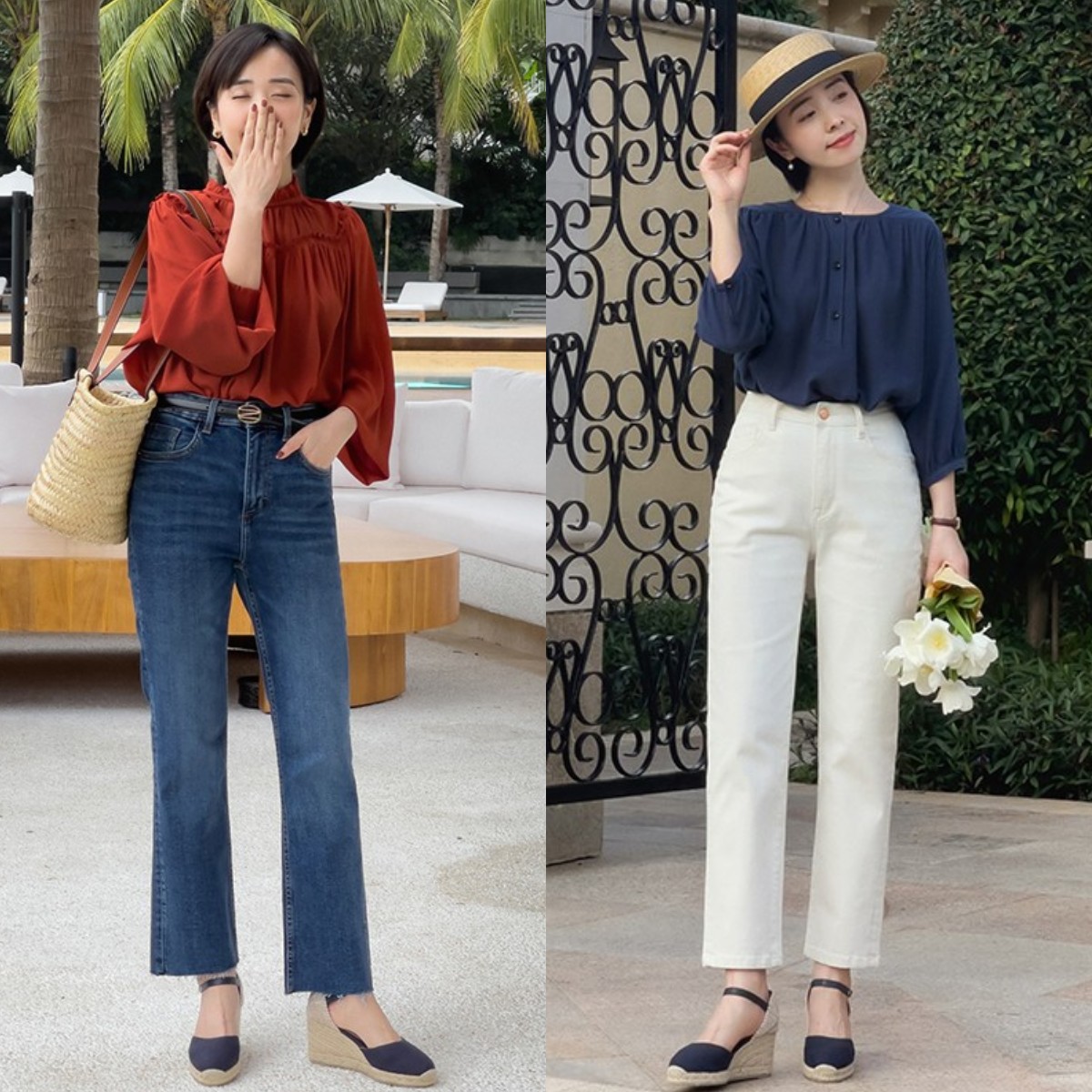 如果想要降低撞衫率,我们可以选择设计感强一些的衬衣,像是下图中的这种加入了压褶处理、泡泡袖设计的款式就是很不错的选择。搭配9分长度的牛仔裤,同时结合“塞裤腰”的穿法,不仅可以穿出超高回头率,还能打造出利落知性的风格。