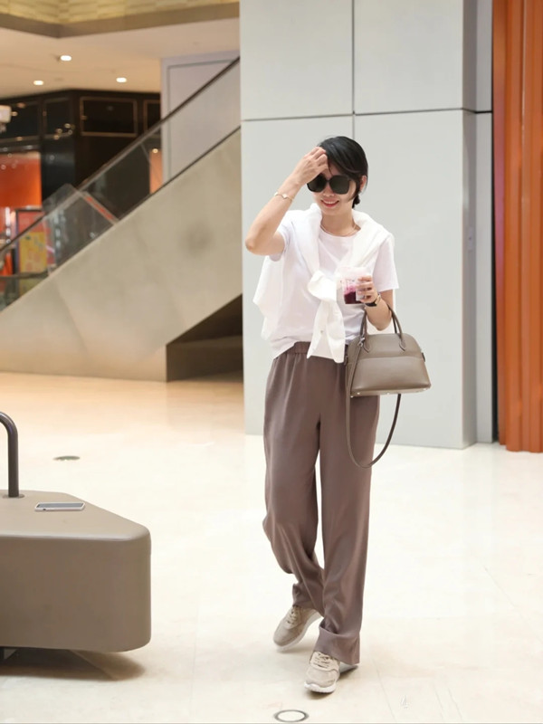 修身T恤与宽松阔腿裤,刚好一紧一松,在松紧之间将四五十岁女人潜在的身材赘肉遮挡、松垮肥大感摒弃,轻而易举地彰显出成熟女人庄重文静、内敛大气的高级魅力。