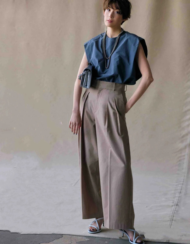 就拿这套造型分析:无袖T恤+阔腿裤,紧与松、窄与宽,版型对比的搭法,平衡了视觉膨胀感。不动声色将宽松阔腿裤在视觉上起到“收”的效果,防止了肥大的裤管出现松垮感,致使身材被拉宽,让四五十岁的女人在穿着舒适舒心的同时,又达到遮肉显瘦又不臃肿的效果。