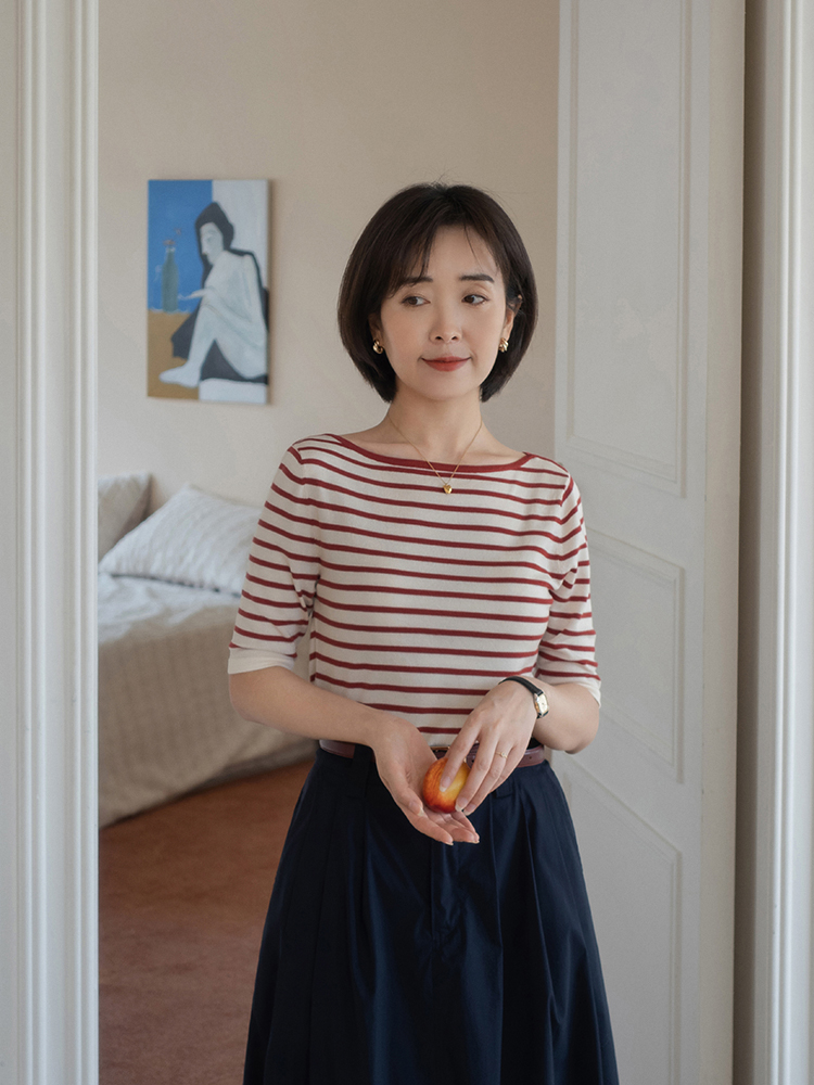LOOK1:红白条纹短袖针织衫+A字半身裙。