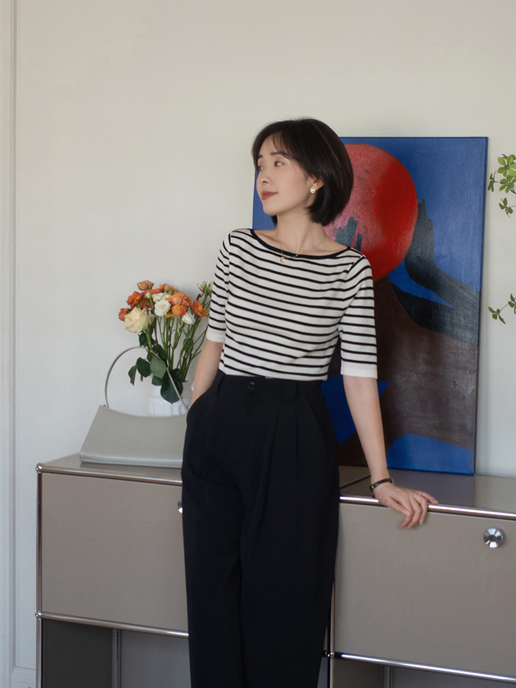 我们先来看红白条纹短袖针织衫,从“颜色”上来说是非常潮,也是很经典的颜色搭配,大圆领的设计上身之后也不勒着脖子,会比较舒适。