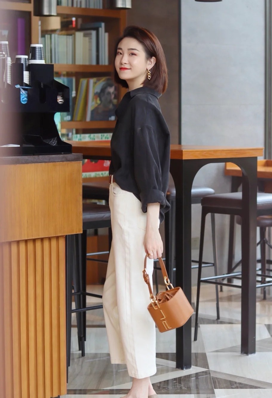 这个博主用黑色衬衫配上白色直筒裤,简约的黑白配显得气质很好,而且经典的色彩也能够营造出高级感,并不会觉得花哨。