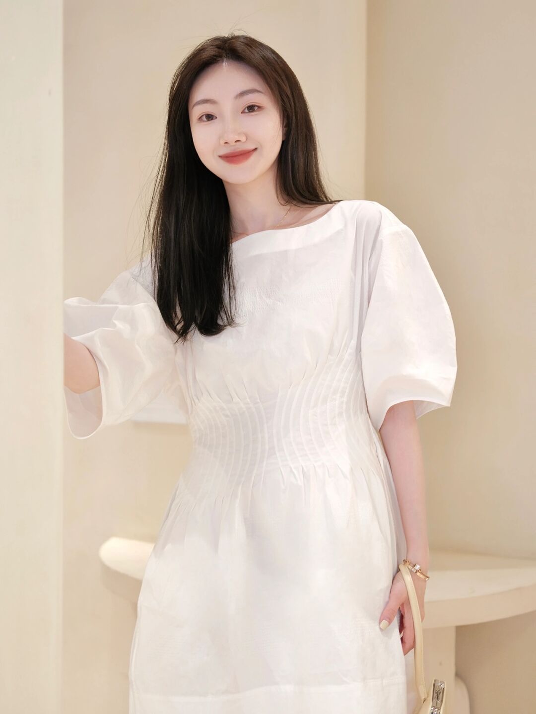 不过今天我们先看短款的连衣裙,就和下面这位博主穿搭的一样,她也是选择收腰的设计,这样可以很好地提升腰线,视觉感会更加显高显瘦。裙摆的也刚刚到膝盖位置,这样自然就不压身高了。