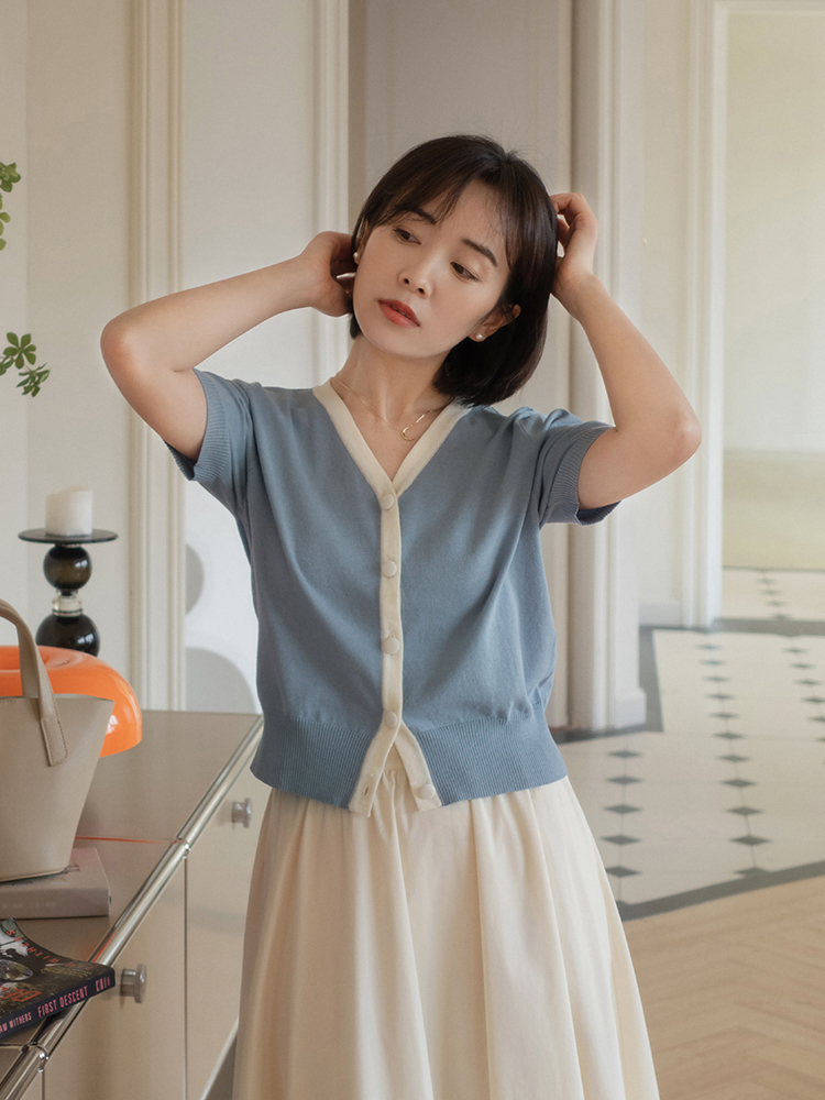 法式V领短袖针织开衫设计,可以很好地修饰你的颈部线条感,同时可以展现出你锁骨的优势,抢眼又抢镜。