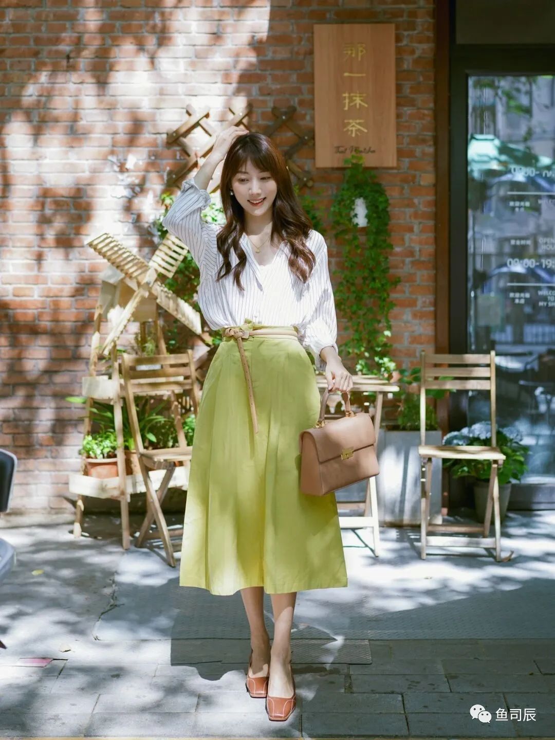 LOOK1:条纹衬衫+浅黄绿A字半身裙。