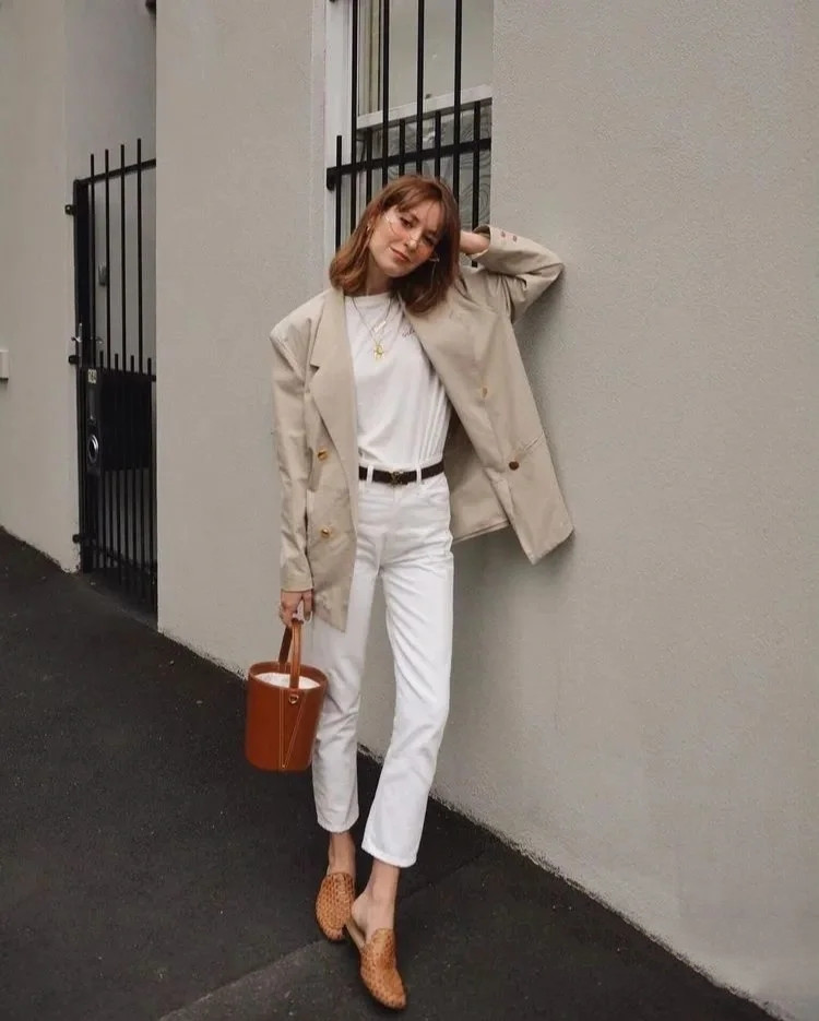同色系详细举例:白T恤+小白裤,既运用“上衣短、裤子长”的搭法,又采取了同一色系、同一颜色的同色系配色方案,让上下装浑然一体、宛若天生,从上至下达到延伸身形,显高显瘦的效果。即使是对色彩感知力不强的女性,通过该方式也能塑造出时髦造型。