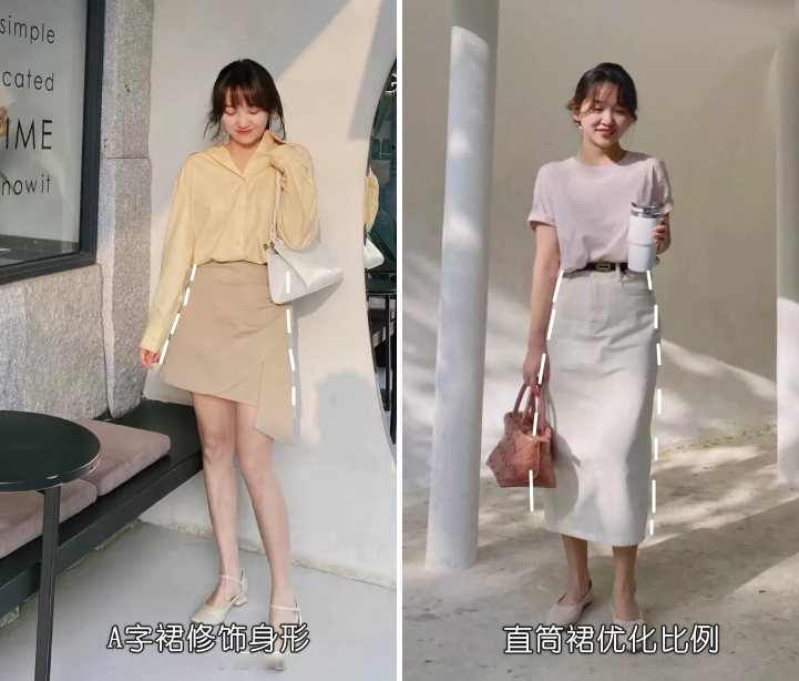 对于小个子女生来讲,曲线感的优势在于能让穿着更加的有线条感,能够显高显瘦,同时还能营造风格。比如说收腰上衣,略微收腰的设计展现出腰线,能很好地显示出比例,搭配一条高腰阔腿裤,整体看上去就很纤细修长。而鱼尾裙的设计,增加了女性感,搭配一件短款上衣,穿着上既有风格又展现出好的身形比例。