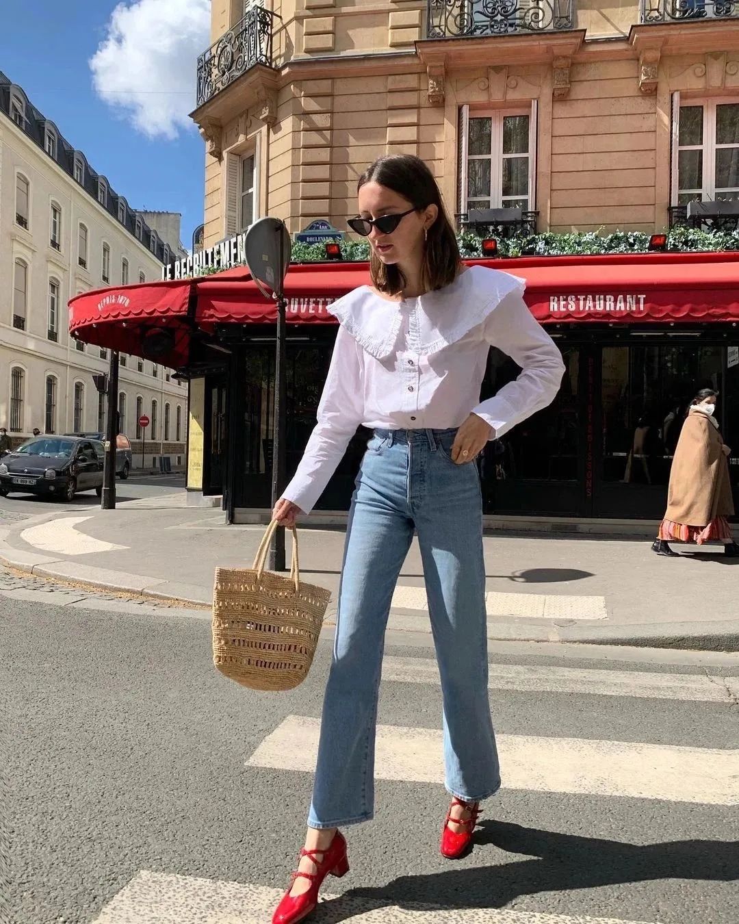 除了镂空元素也会组合木耳边的拼接方法,木耳边的袖扣包边也刚好与它相呼应,搭配牛仔裤最好是把衣服塞进裤子里,或者选择短款小衫。主要是为了打造三七分的一个概念,显瘦显腿长。