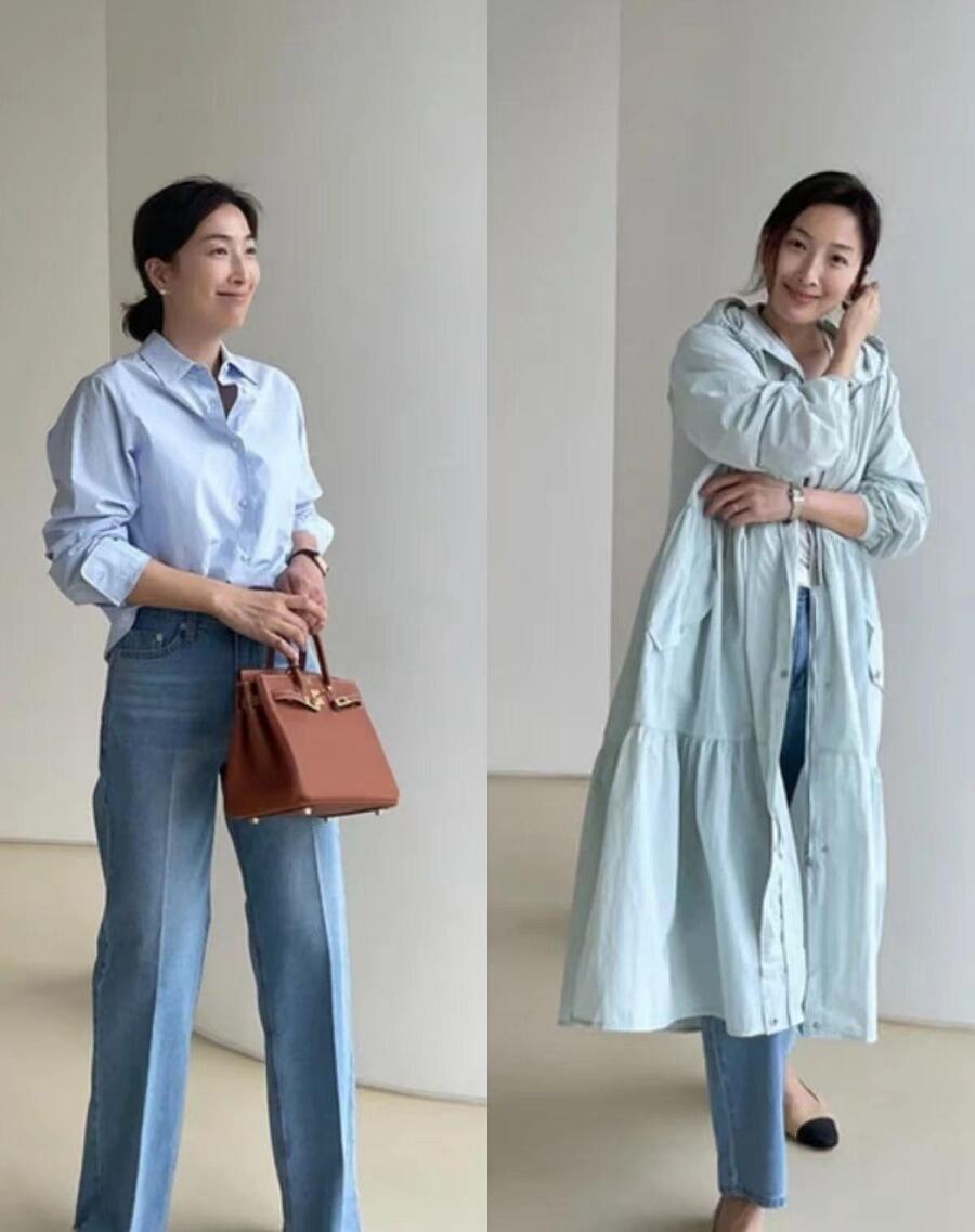 浅蓝色附着在一些基础款上,往往能够悄悄缓解严肃与枯燥感,比如浅蓝色衬衫、浅蓝色防晒衫、蓝色牛仔裤,都蛮适合中年女人。