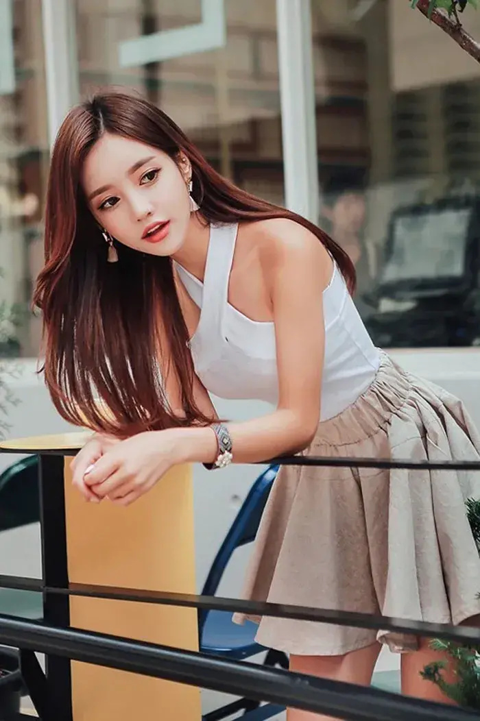 夏天时尚穿搭图片 小姐姐一席卡其色短裙+白色挂脖背心 尽显好身材!(3)
