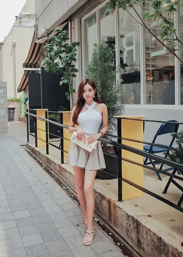 夏天时尚穿搭图片 小姐姐一席卡其色短裙+白色挂脖背心 尽显好身材!(4)