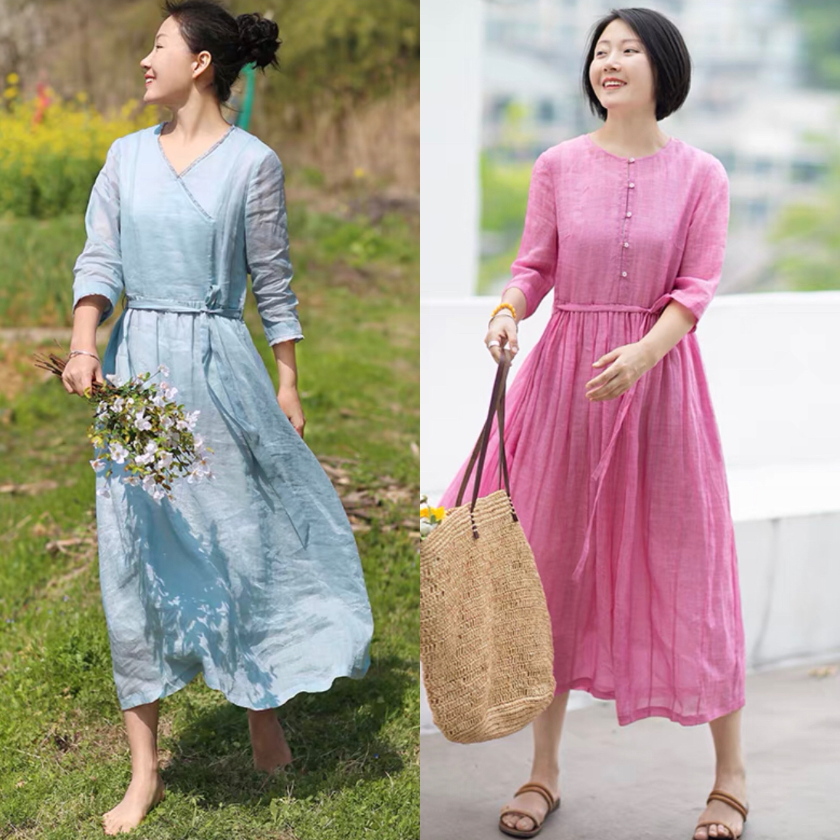 首先,碎花的色彩一定要用浅色调,比如一些明度感的浅蓝色、浅粉色、米黄色……其次便是面料的运用,避开太廉价的蓬松感薄纱,选择柔软的棉麻就可以了。