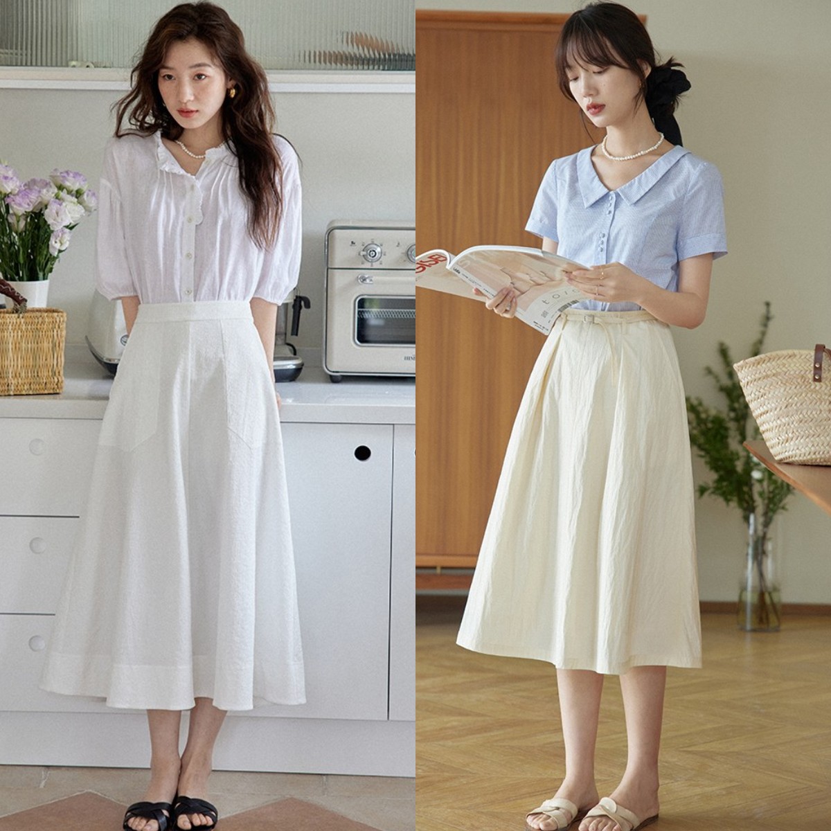 衬衫材质的小白裙可以穿出和上两种材质截然不同的感觉,白色衬衫裙线条感十足,上身气质又干练,非常适合通勤,夏日OL风穿搭的首选!微胖型身材就可以试试下图(左图)中的这种版型挺阔一些的衬衫裙,能够很好的修饰身形,简单即高级!