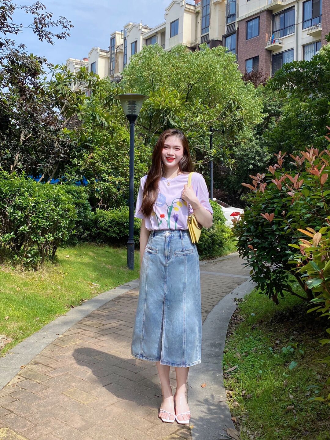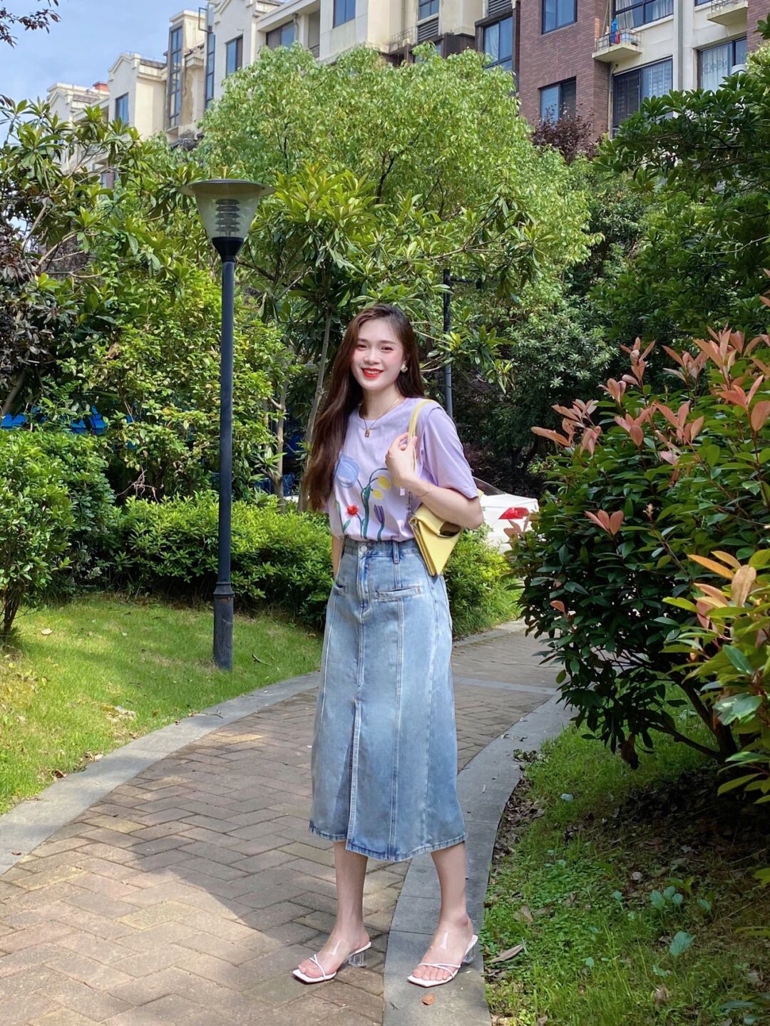 单身简单的搭配上一条牛仔开叉半身裙,轻松展厅年轻女性的甜美与温柔气质。再采用这种长裙的设计的话,又可以我们大部分的腿部线条不会显得有些轻浮,反而有一种稳重内敛又温柔的感觉。
