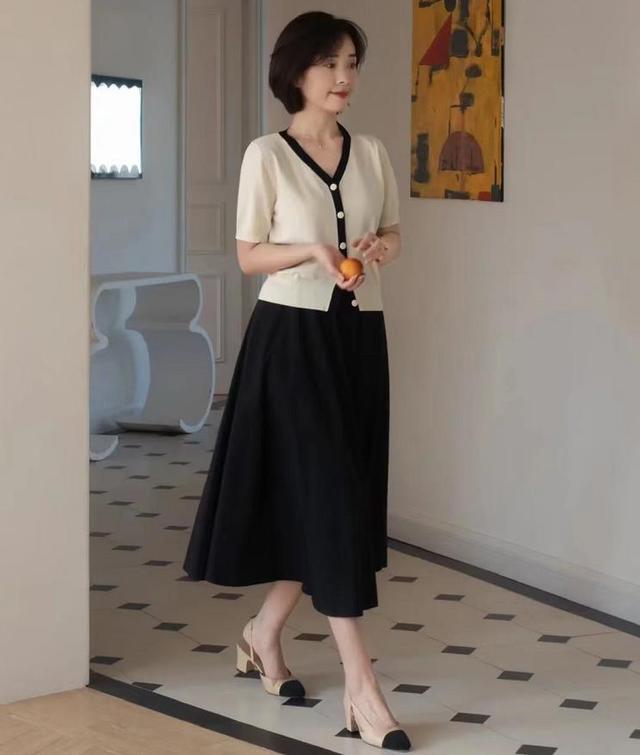 这一套夏季穿搭,瞧着的第一眼就很显气质和温柔,你觉得呢?杏色针织短袖,小短款的设计,穿起来不仅提高了腰线比例,还多了几分利落感。衣领处黑色拼接设计,打破了针织衫的单调。