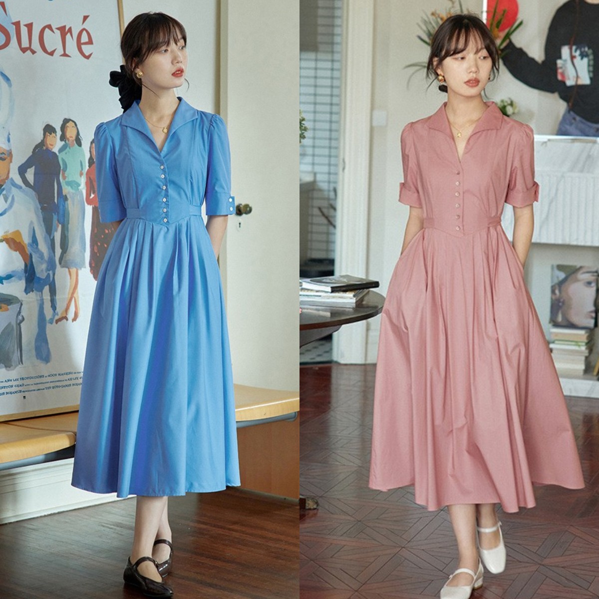 如果你喜欢严肃一些的造型,那就比较推荐你入手下图(左图)中的这种设计简单一些的小翻领衬衣裙。如果你想打造出日常通勤两相宜的造型,那就比较推荐你入手右图中的这种选用了“蛋糕裙多层次”设计的衬衣裙,既能增添活力俏皮的属性,又能满足职场所需的正经感,会让你的气质加分不少哦。