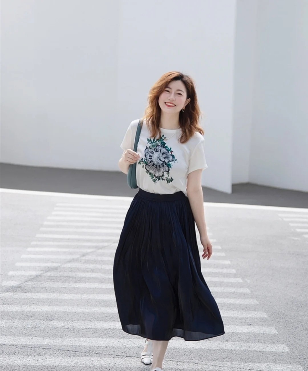 为了防止太多的黑色挤压在一起,形成明显的暗沉感的堆积,可以选用白色印花T恤和这种设计比较单调的黑色裙装配合。裙装的样式简约,而又对腿型带有包容性,穿上多年都不会被淘汰。