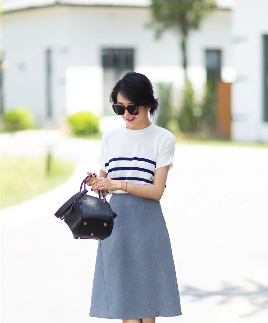 像这件条纹T恤,依旧选用了大面积的白色作为主打的色系,有了这种颜色打下一个百搭的基调之后,下半身的裙装选用就没那么多的约束。采取高级的蓝色单品与T恤组合,可以打造出相当优雅的风格,配色也不会死板单调。
