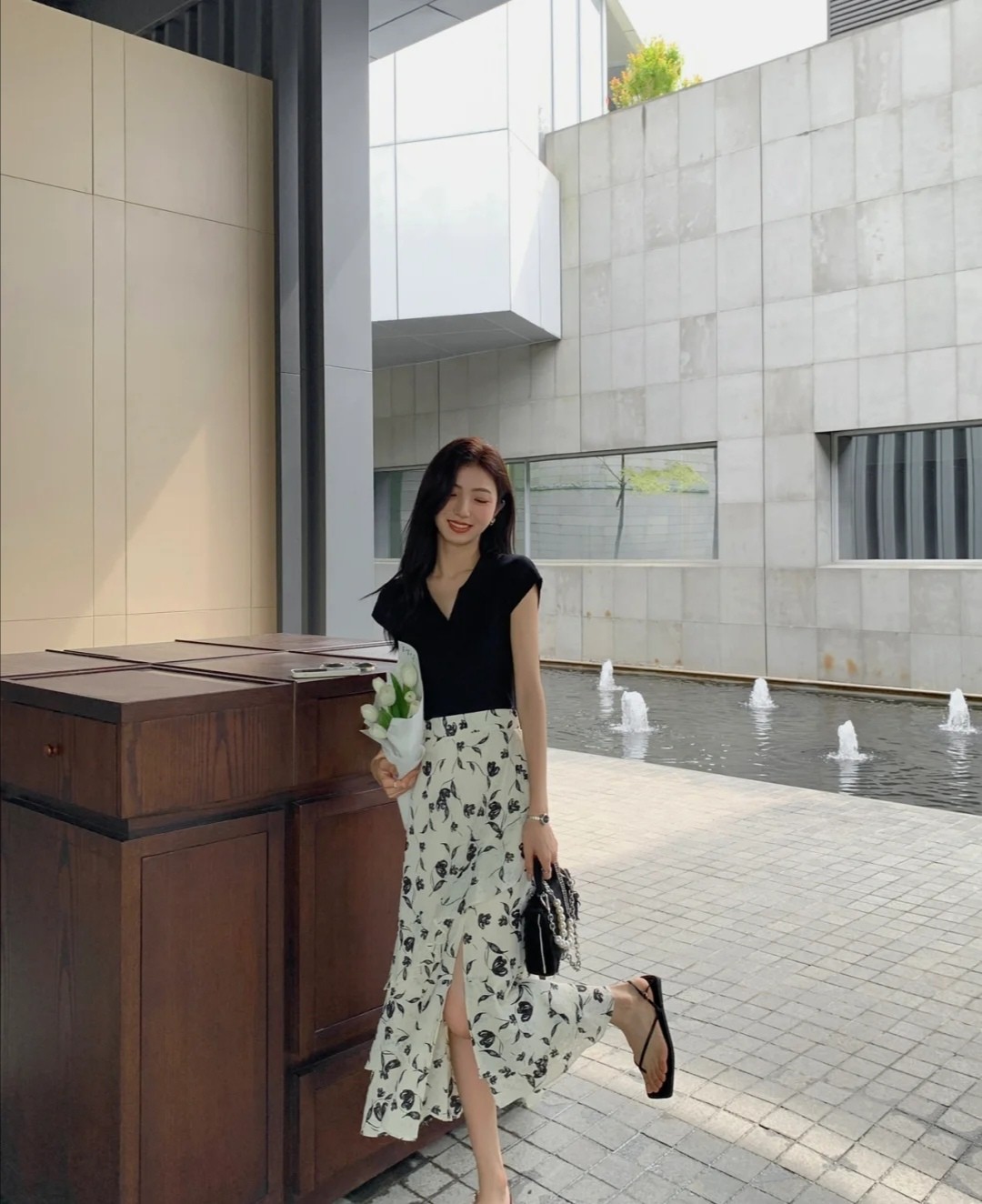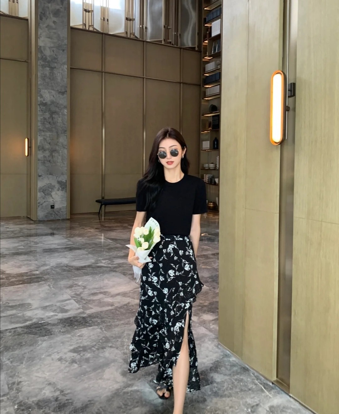 这件黑色的T恤,自然是大家最信赖的一大单品,属于绝对的基础款。这款服装的特点在于配色方面无所顾忌,可以结合底色与之一致的印花半身裙。黑底白印花裙装的加入,增加色系之间的衔接性,又在侧面有高开衩元素,看起来更加妩媚动人。