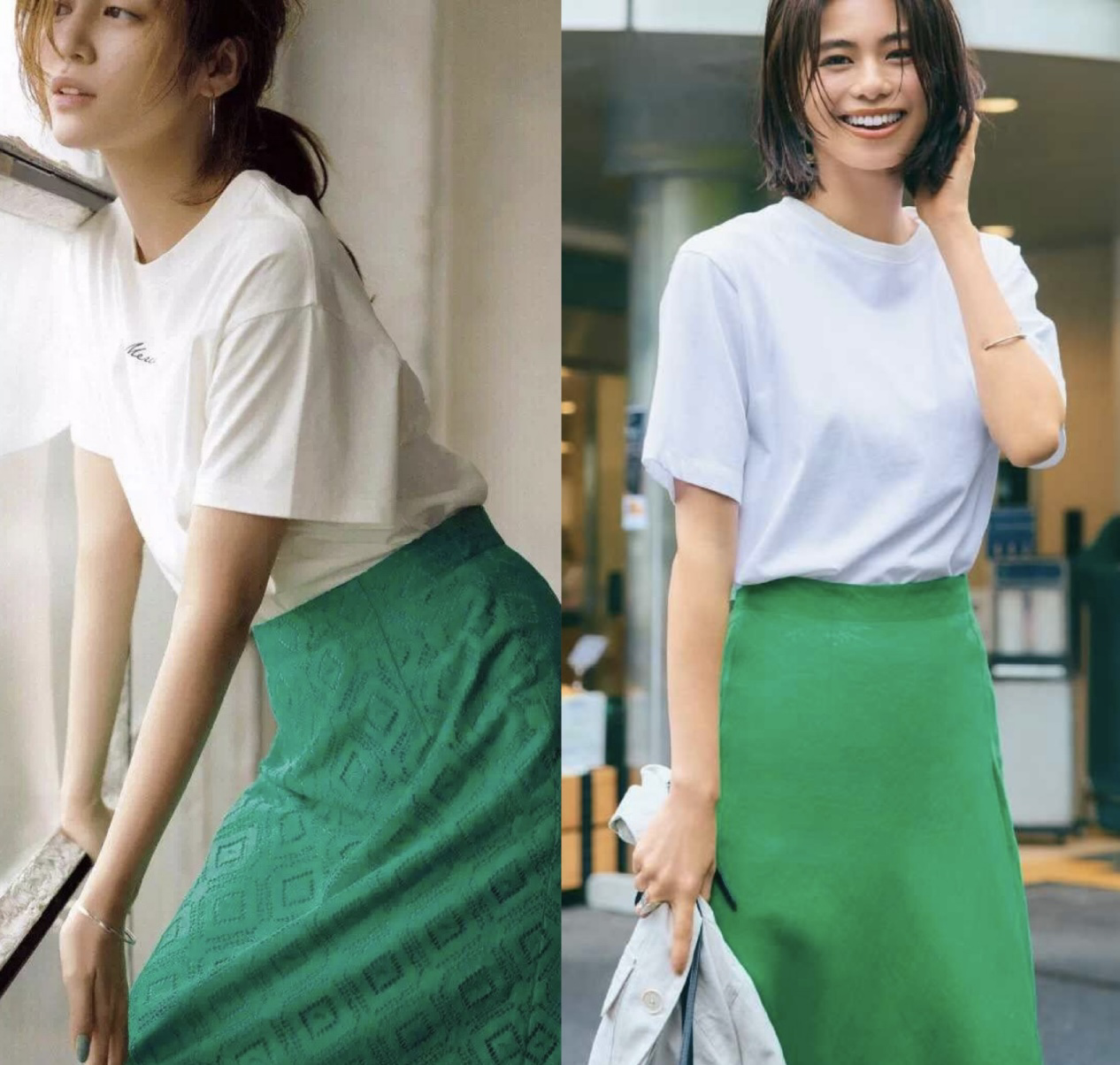 可以尝试白色的T恤,搭配绿色的半身裙,白色和绿色的结合,会让风格看起来更加生动,使搭配也变得更有少女感,这样的配色会避免穿搭过分单调。