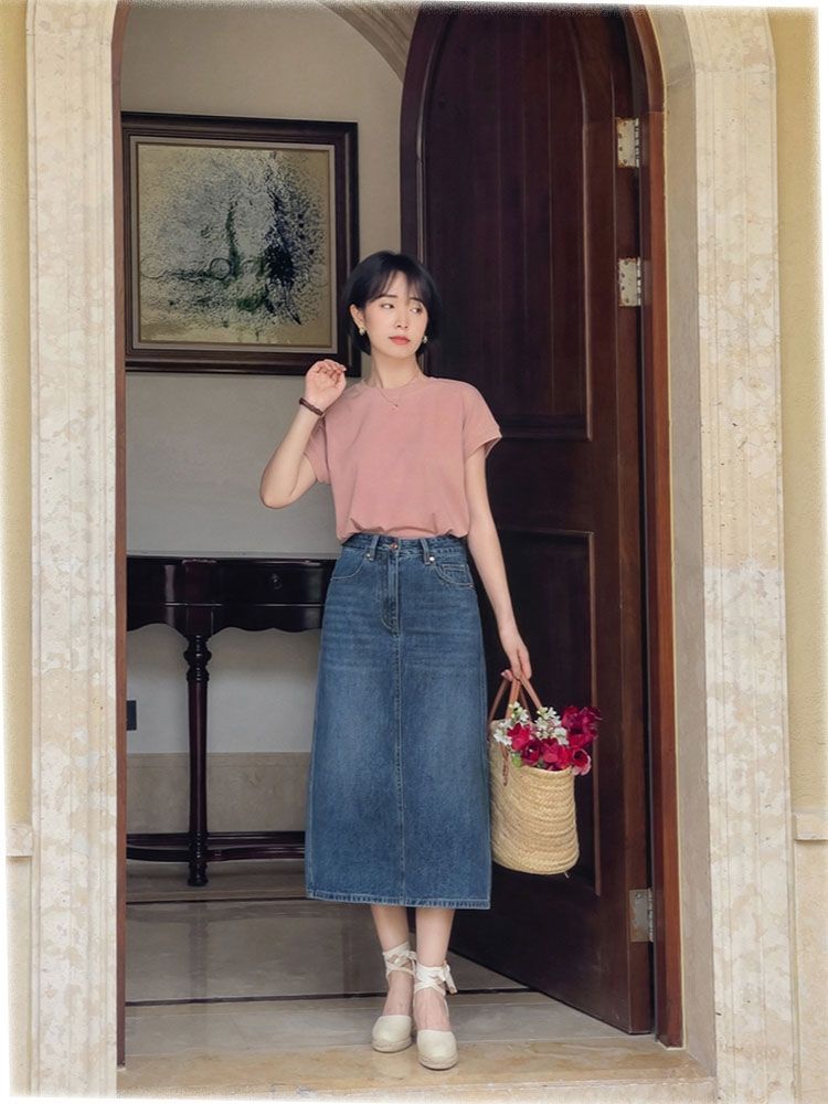 你也可以把它称为淡粉色,这种颜色属于莫兰迪色系的一种,带着一点点橘调和灰调,让整体的饱和度大大降低了不少,所以驾驭起来就不会太挑皮肤了。即使你是偏黄的皮肤也可以完美的hold住。一件橘粉色短袖T恤,搭配蓝色牛仔裤,看上去温柔又显气质。