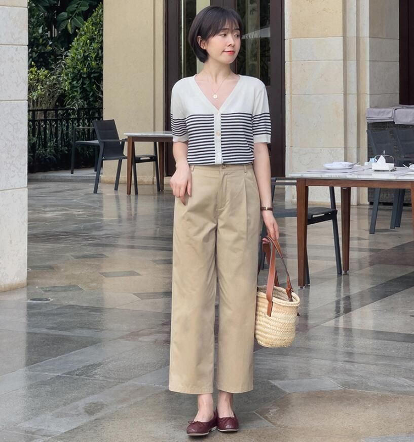 关于“杏裤”到底应该如何选择?其实这个问题的答案在其他的裤装中也适用。首先作为色彩较浅的裤子,版型或许紧绷一定不可取,相反选择宽松有度的版型更有效;建议大家可以选择阔腿裤、直筒裤、锥形裤等裤装款式,可以达到实际上的显瘦效果,遮肉感更是一绝!